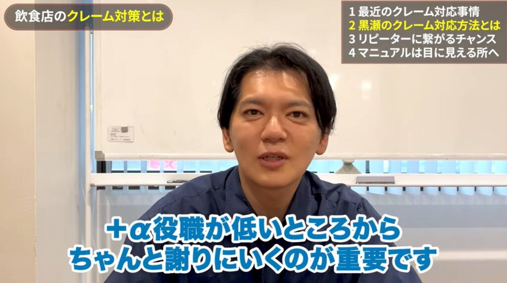 この段階を踏むことで、「次、もっと偉い人が出てきた」という形で、お客様の納得感を高めながら、どこかの段階で必ず問題を解決に導くことができます。役職が低いところから、しっかりと謝りに行く姿勢も重要です。ただし、アレルギー対応などの緊急事態の場合は、この段階を飛ばしてすぐに病院に行くなど、迅速な対応を最優先します。