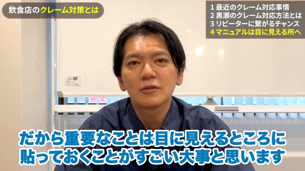 アルバイトスタッフでも冷静に対応できるよう、クレーム対応の重要なルールは必ず目に見える場所に貼り出し、明確化しておくことが必要です。普段目に触れない場所にあるルールは、緊急時に忘れ去られてしまいます。重要なルールは、誰もがすぐにパッと見て対応できるよう、目に見えるところに貼っておくことが、オペレーションの確実性を高めます。